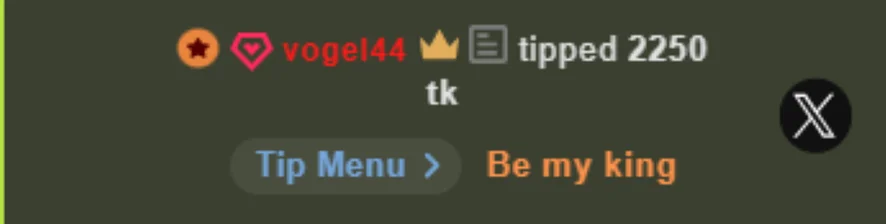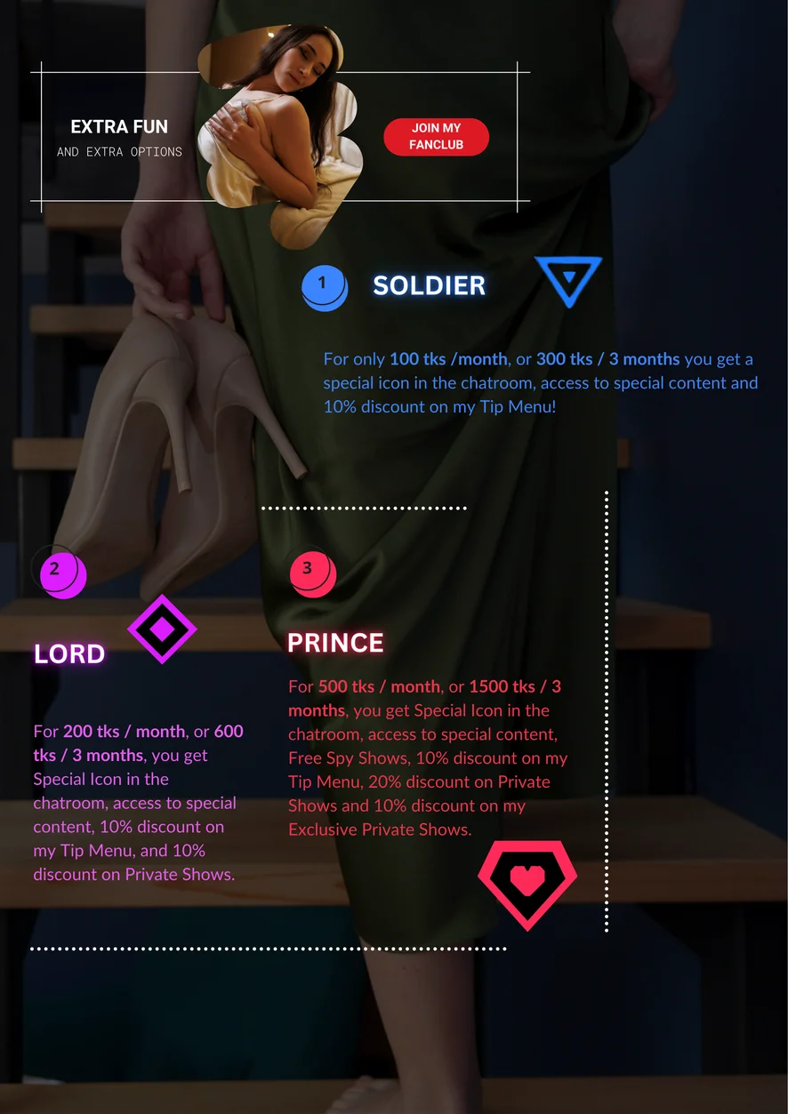 도기 스타일, 에로틱 댄스, 스팽킹, 하이힐, 상의탈의, 트월킹, 치마속, 코스프레, 음란한 대화, 핑거링, 자위, 스트립쇼, 롤플레이, 핸드잡, 카멜토우, 아헤가오, 블로우잡, 자지 평점, 굴욕, 젖치기, 스트랩온, 분수, 스모킹, 풋 페티시, 딥스로트, 미스트레스(여주인), 오르가즘, 딜도 또는 바이브레이터, 자위행위 지침