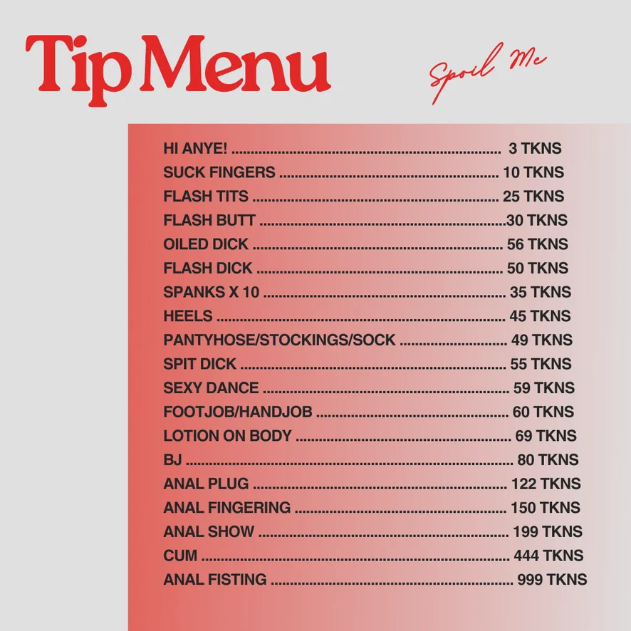 도기 스타일, 아헤가오, 스팽킹, 에로틱 댄스, 자지 평점, CEI(정액 먹기 교육), 음란한 대화, 마 사지, 젖치기, 하이힐, 트월킹, 치마속, 상의탈의, SPH(작은 음경 능욕), 풋잡, 핸드잡, 블로우잡, 롤플레이, 자위행위 지침, 굴욕, 스모킹, 플래싱, 풋 페티시, 스트립쇼, 페이스씨팅, 딜도 또는 바이브레이터, 핑거링, 젖소, 하드코어, 오일 쇼, 오르가즘, 나일론, 자위, 프리컴, 애널 기구, 섹스 기구, 사정 플레이, 딥스로트, 피스팅, 사정, 컴샷, 애널