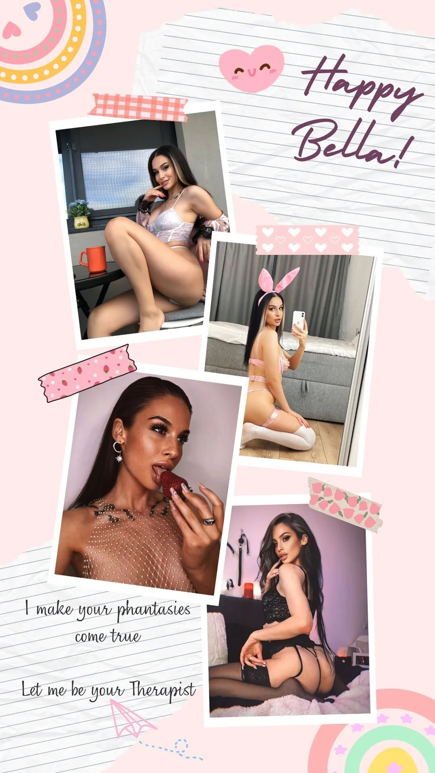 플래싱, 상의탈의, 트월킹, 카멜토우, 도기 스타일, 에로틱 댄스, 오일 쇼, 아헤가오, 블로우잡, 풋 페티시, 핸드잡, 하이힐, 자위, 니플 기구, 스팽킹, 젖치기, 스위치, 스트립쇼, 핑거링, Squirt - 300 Tk, 딥스로트, 음란한 대화, 재갈, 하드코어, 굴욕, 자위행위 지침, 미스트레스(여주인), 오르가즘, 롤플레이, 섹스 기구, 딜도 또는 바이브레이터