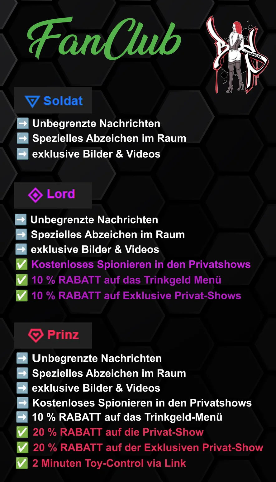 ⭐️JOIN MY FAN CLUB⭐️ Enjoy free images and videos as a SOLDIER. You will receive a special badge in the chat room and can chat with me. 💙 As a LORD, you can also spy on private shows for free. 10% discount on my tip menu and 10% discount exclusive private chat💜 As a PRINCE you get an additional 10% discount on my tip menu and 20% discount on private chat and exclusive private chat. Toycontrol for 2min❤️
