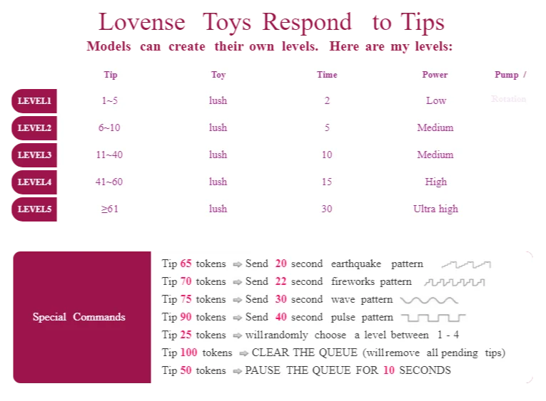 핑거링, 스팽킹, 상의탈의, 딜도 또는 바이브레이터, 애널 기구, 스트립쇼, 샤워, 니플 기구, 음란한 대화, 분수
