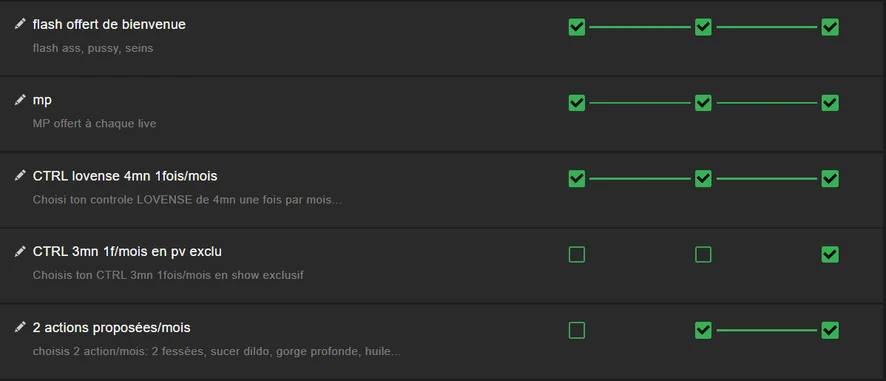 자지 평점, 오일 쇼, 니플 기구, 스모킹, 핸드잡, 블로우잡, 스팽킹, 딥스로트, 딜도 또는 바이브레이터, 자위, 상의탈의, 섹스 기구, 핑거링, 도기 스타일, 애널, 애널 기구