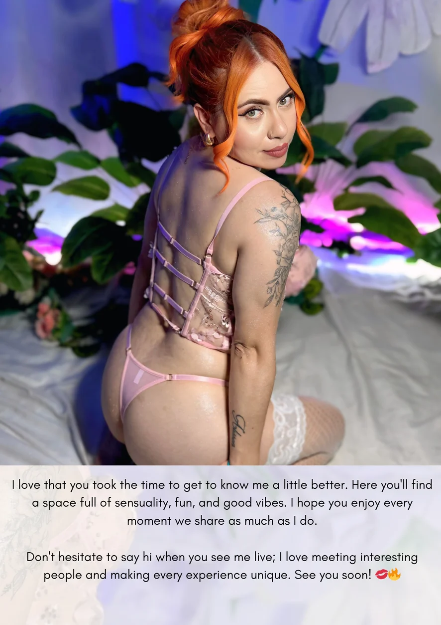 Me encanta que te hayas tomado el tiempo de conocerme un poco más. Aquí encontrarás un espacio lleno de sensualidad, diversión y buena energía. Espero que disfrutes tanto como yo cada momento que compartimos. No dudes en saludarme cuando me veas en vivo, me encanta conocer a personas interesantes y hacer que cada experiencia sea única. ¡Nos vemos pronto! 💋🔥