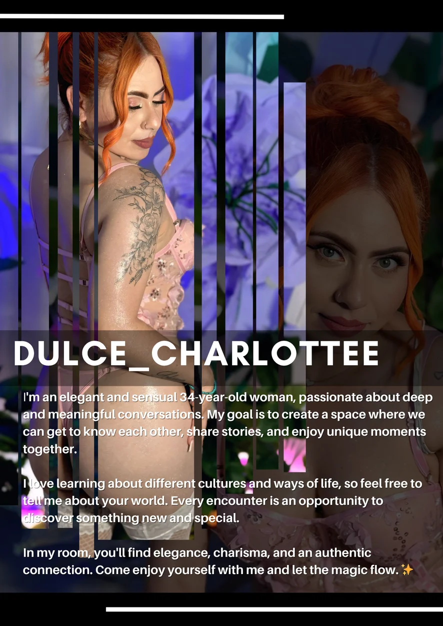 Hola, soy Dulce , una mujer elegante, sensual y apasionada por las buenas conversaciones. 🌹 Aquí encontrarás un lugar donde conectaremos, compartir risas y descubrir juntos momentos inolvidables. Me encanta conocer a cada uno de ustedes, aprender de sus historias y explorar diferentes culturas. Así que siéntete como en casa y hablemos de todo aquello que nos inspire y nos haga disfrutar. 💎 Reglas importantes: Recuerda ser siempre respetuoso y amable; juntos podems crear un ambiente único. 🎉 No olvides unirte a mi Club de Fans para disfrutar de contenido exclusivo y muchas sorpresas especiales. Gracias por estar aquí y hacer de mi sala un lugar tan especial. ¡Ahora, relájate y disfruta de la magia conmigo! 💃✨