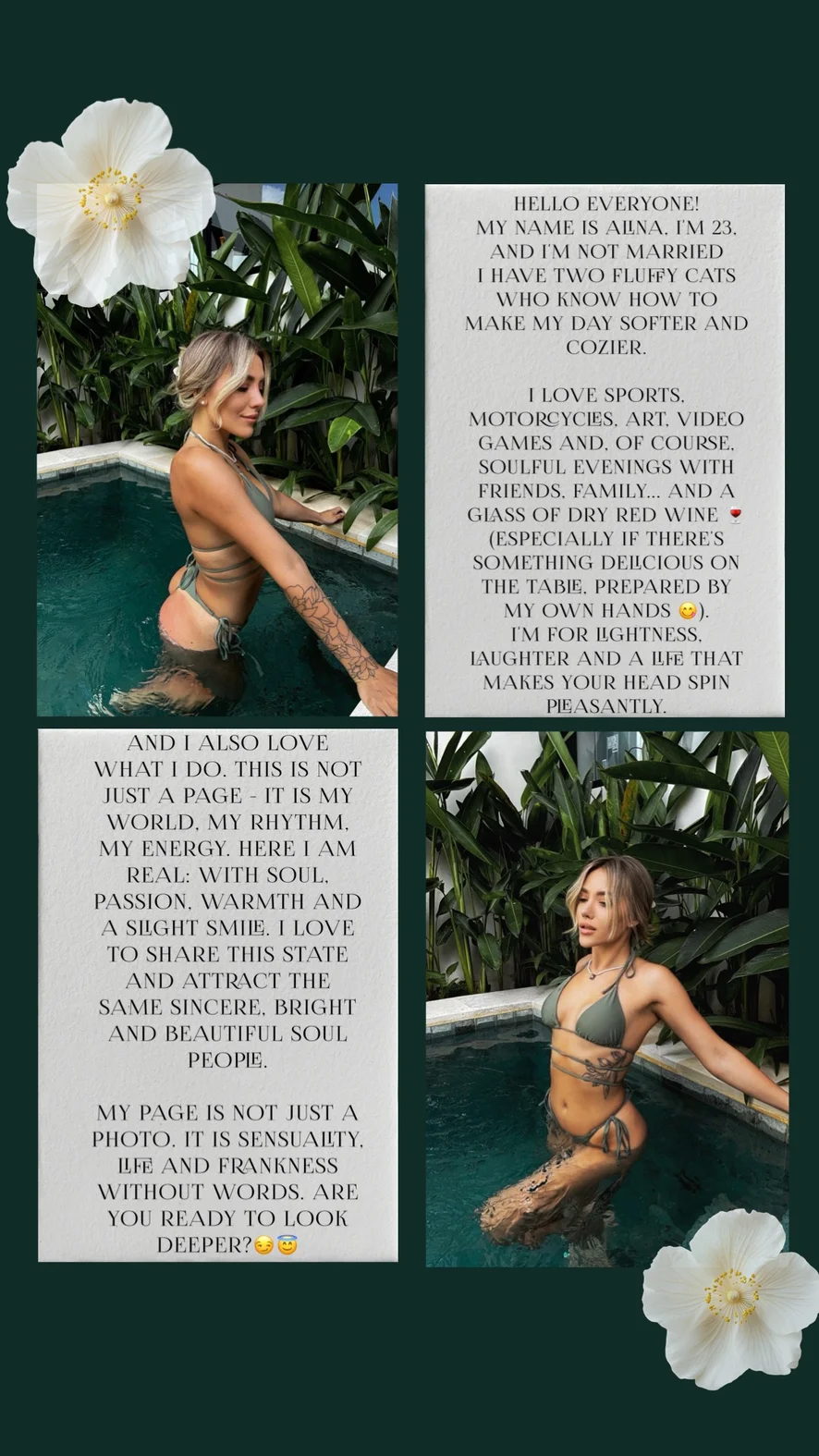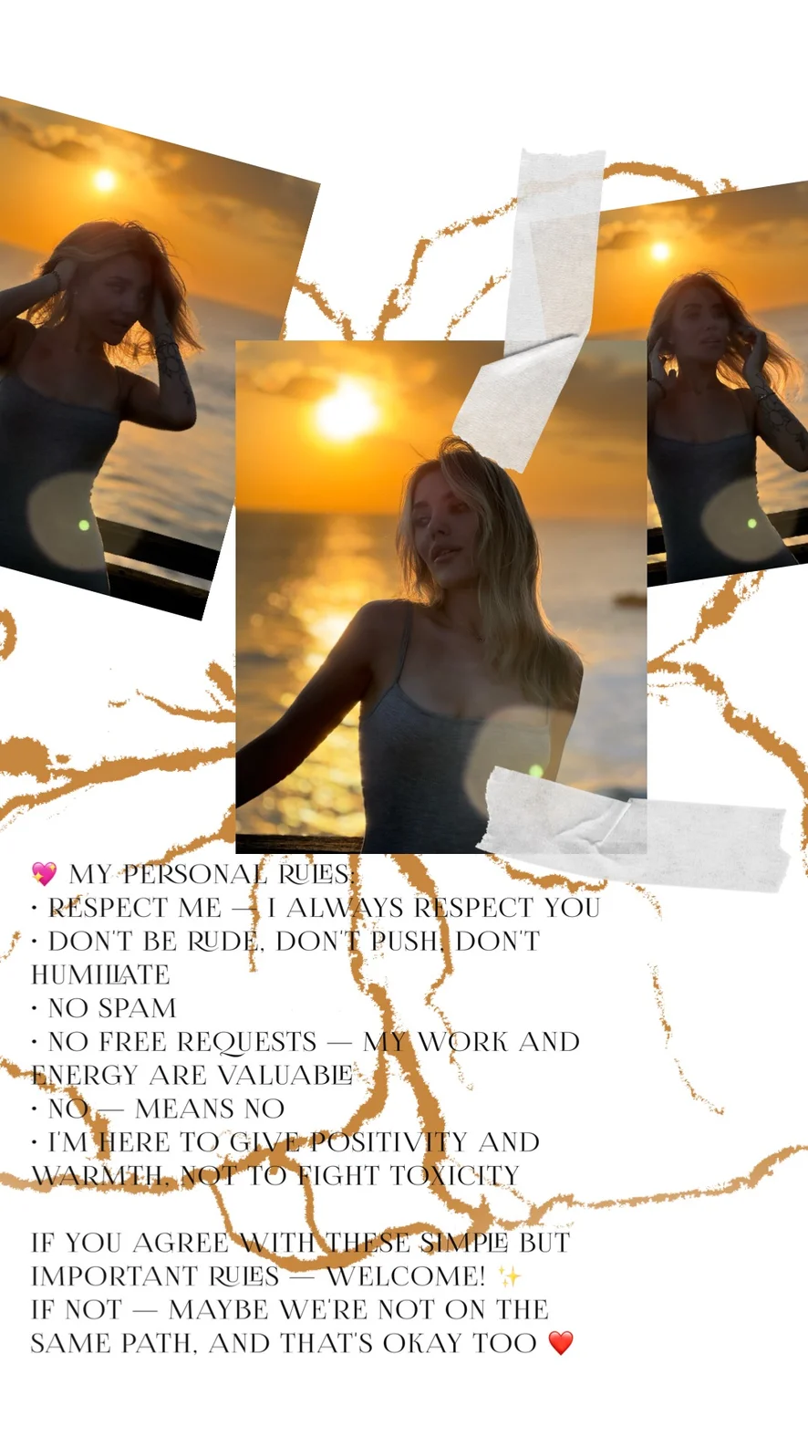 My personal rules • Respect me, I always respect you • Do not be breasts, do not push, do not humiliate • No spam • Do not insult other participants • Without free queries - my work and energy are valuable • Don't ask me to do something for free • No - means no I am here to give positive and warmth, and not for proper toxicity If you agree with this simple, but important rules are welcome! If not, perhaps we are not on the same path, and it's also normal😉