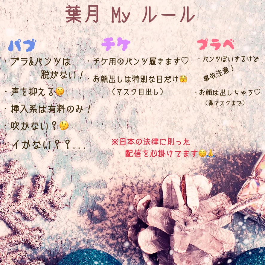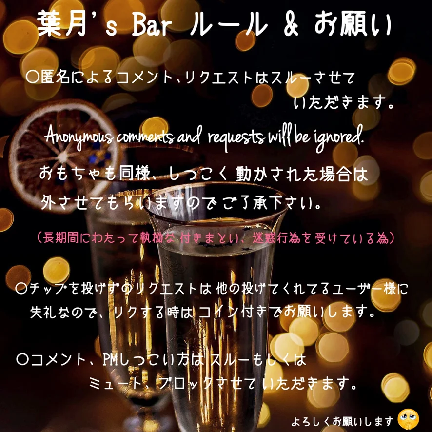 ◯ライブ配信の録画 その録画の転載 販売を禁止します。 Live streaming recording Reproduction and sale of the recording are prohibited. ◯日本の法律を守って配信してるので性器の露出の強要はお辞めください。 ◯暴言や荒らし行為等は他の視聴者様へのご迷惑になるので、お辞めください。 Ranting and vandalism will cause inconvenience to other viewers, so please stop. ◯過度な要求をしないでください。 Please don't make excessive demands. ◯視聴者様同士での言い合いや喧嘩はしないでください。 ◯コインなしのリクエストにはお応え出来ません。 プレゼントメニューにないものはコインを添えてリクエストしてください。 We cannot respond to requests without coins. Please request items that are not on the gift menu with coins. ◯全てのリクエストが出来るわけでないです。 ◯過去のチケチャ、グルチャの内容は配信内でコメントしないでください。 ◯配信動画や画像の無断転載は法的措置を取ります。 Unauthorized reproduction of broadcast videos and images will take legal action. ◯マナーのない方やルールの守れない方はミュート/ブロックさせていただく場合があります。 ◯個人のプライバシーを特定するような発言、不快なコメントをされた方はミュート/ブロックさせていただきます。