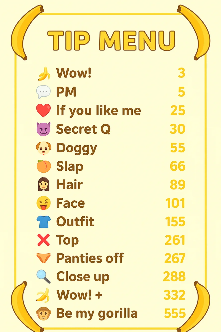 블로우잡, 도기 스타일, 에로틱 댄스, 핸드잡, 오일 쇼, 상의탈의, 오르가즘, 페이셜, 요가, 카멜토우, 하드코어, 스트립쇼, 섹스 기구, 딥스로트, 음란한 대화, 플래싱, 니플 기구, 핑거링, 풋 페티시, 스팽킹, 가죽, 치마속, 아헤가오, 자위, 분수, 페이스씨팅, 젖소, 자지 평점, 애널, 애널 기구, 더블 페네트레이션, 딜도 또는 바이브레이터, 엉덩이에서 입까지