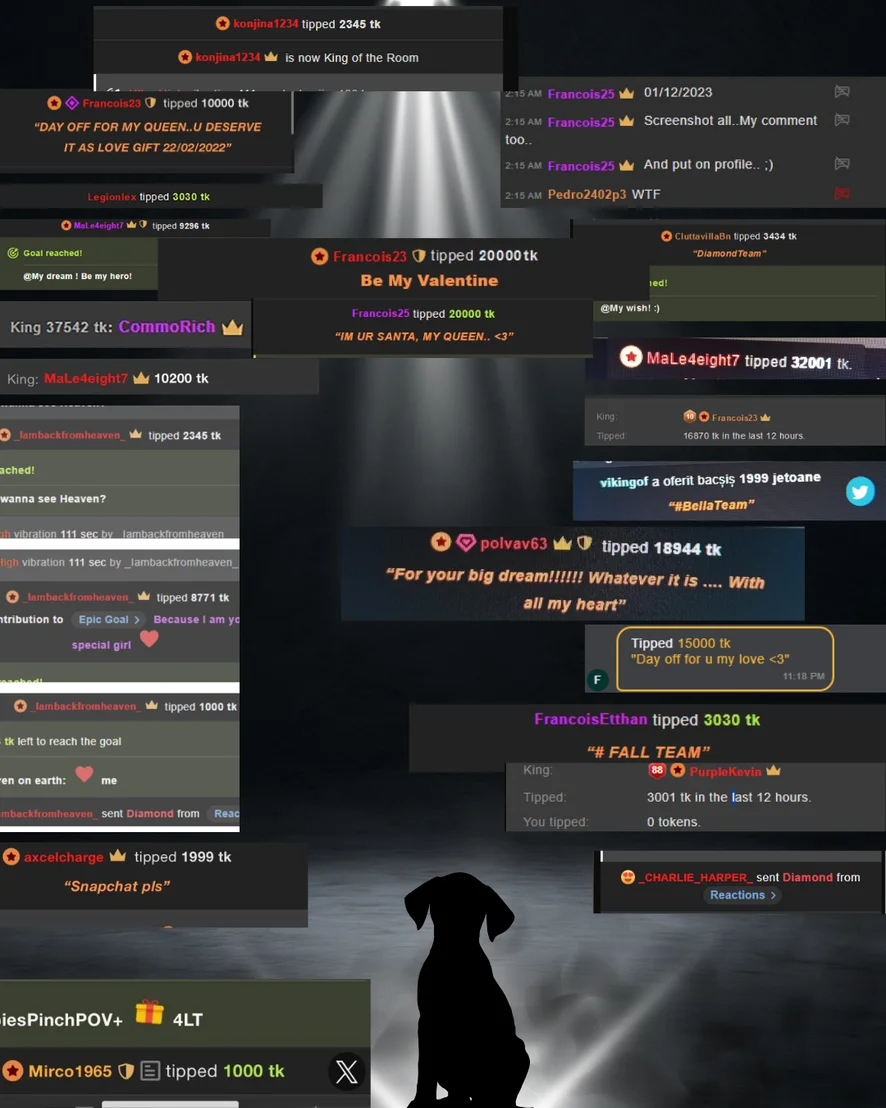 오일 쇼, 에로틱 댄스, 샤워, 트월킹, 스트립쇼, 스모킹, 도기 스타일, 딥스로트, 스팽킹, 크림파이, 페이스씨팅, 야외, 아헤가오, 분수, 플래싱, 블로우잡, 상의탈의, 자위, 젖치기, 딜도 또는 바이브레이터, 하드코어, 섹스 기구, 카멜토우, 오르가즘, 치마속, 젖소, 핑거링, 풋 페티시, 하이힐, 라텍스, 애널 기구, 음란한 대화, 핸드잡, 스트랩온, 자지 평점, 자위행위 지침, 나일론, 니플 기구, 오피스, 애널