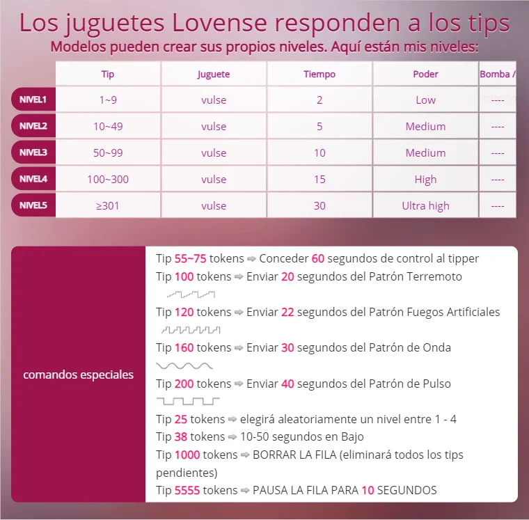 아헤가오, 에로틱 댄스, 블로우잡, 상의탈의, 트월킹, 요가, 스팽킹, 카멜토우, 핑거링, 딜도 또는 바이브레이터, 풋 페티시, 딥스로트, 섹스 기구, 핸드잡, 오일 쇼, 자위행위 지침, 나일론, 치마속, 하이힐, 굴욕, 젖소, 분수, 하드코어, 젖치기, 자위, 롤플레이, 스트립쇼, 크림파이, 페이셜, 스모킹, 자지 평점, 오르가즘, 스위치
