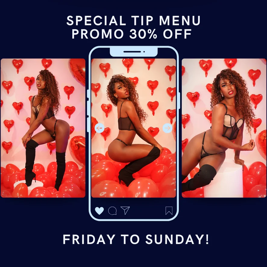 도기 스타일, 스팽킹, 에로틱 댄스, 자지 평점, 컴샷, 음란한 대화, 페이셜, 핸드잡, 오일 쇼, 플래싱, 애널, 크림파이, 핑거링, 엉덩이에서 입까지, 딜도 또는 바이브레이터, 풋 페티시, 사정, 페이스씨팅, 젖소, CEI(정액 먹기 교육), 스위치, 가죽, 스트립쇼, 게이핑, 딥스로트, 섹스 기구, 애널 기구, SPH(작은 음경 능욕), 하이힐