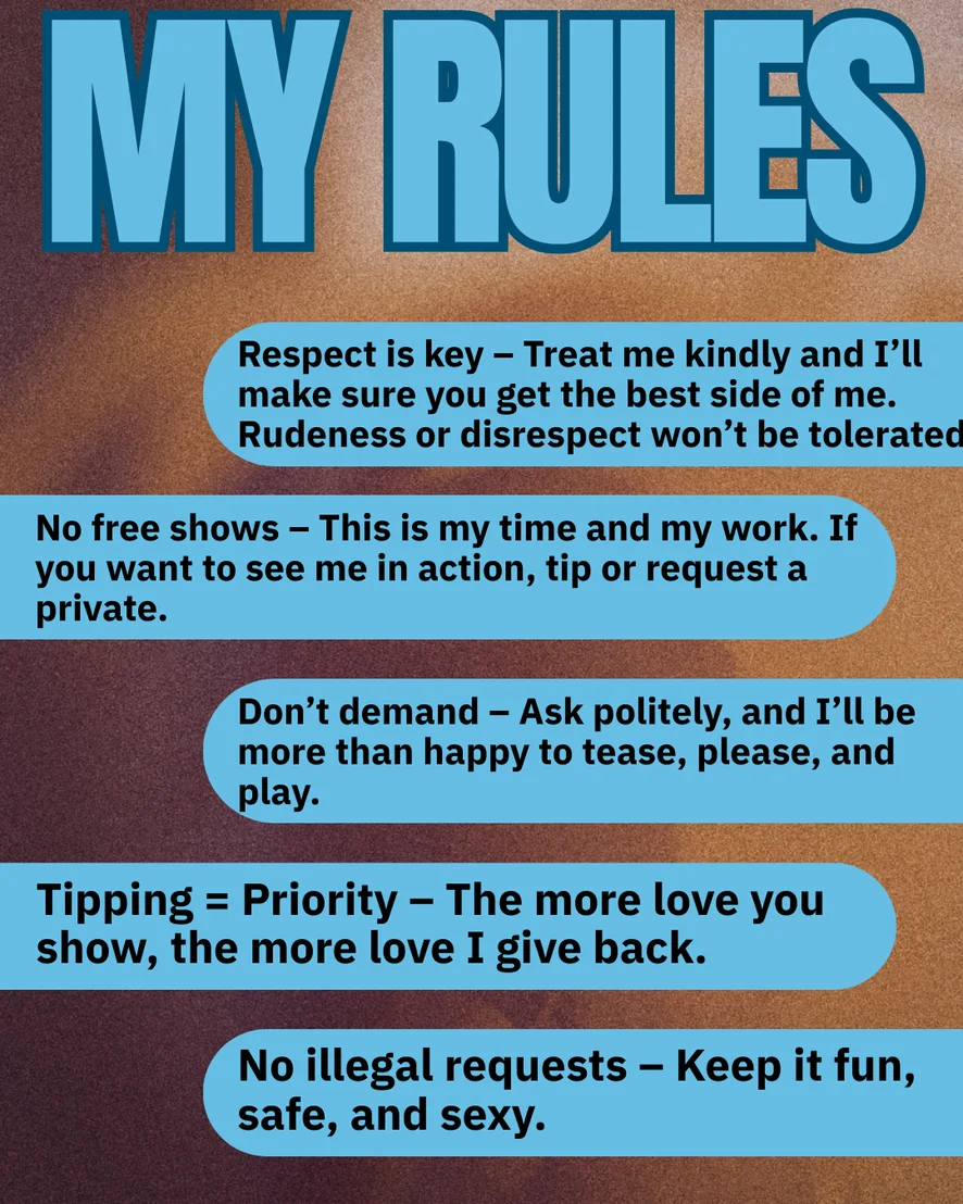 블로우잡, 자지 평점, 딥스로트, 도기 스타일, 핑거링, 풋 페티시, 핸드잡, 자위, 굴욕, 상의탈의, 섹스 기구, 딜도 또는 바이브레이터, 음란한 대화, 젖소, 에로틱 댄스, 스팽킹, 젖치기, 트월킹, 스트립쇼