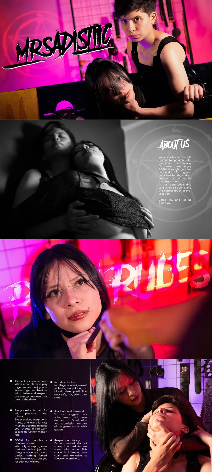 아헤가오, 스팽킹, 음란한 대화, 스트립쇼, 페이스씨팅, 풋 페티시, 스모킹, 게이핑, 자위, 재갈, 굴욕, 하이힐, 상의탈의, 트월킹, 핸드잡, 자위행위 지침, 롤플레이, 니플 기구, 에로틱 댄스, 젖치기, 키스, 오일 쇼, 삼키기, 섹스 기구, 핑거링, 블로우잡, 보지 핥기, 69자세, 라텍스