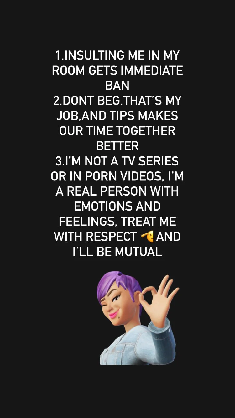 I want my room to be as wild and fun as possible, but sometime rules have to be made to make sure the fun never ends! 1. Be respectful to me and others! We only want to invite good Karma into my room 2. No demands or requests without tips! The stream is the most fun when EVERYONE is having fun. (including me ????) 3. I have the right to refuse to do certain things if they might hurt me or make me uncomfortable, just for my own safety and to keep the stream happy and fun for everyone. 4. Dear grey users please respect and correspond to my room rules. Give me a compliment tell me I’m beautiful or promote my show we call it team work. And it really turns me on and make me cum instant. We are all a team however if you don’t correspond to my rules I ban with immediate effect 5. Do not ask me for a hookup what happens here stay here. I’m a webcam model and professional