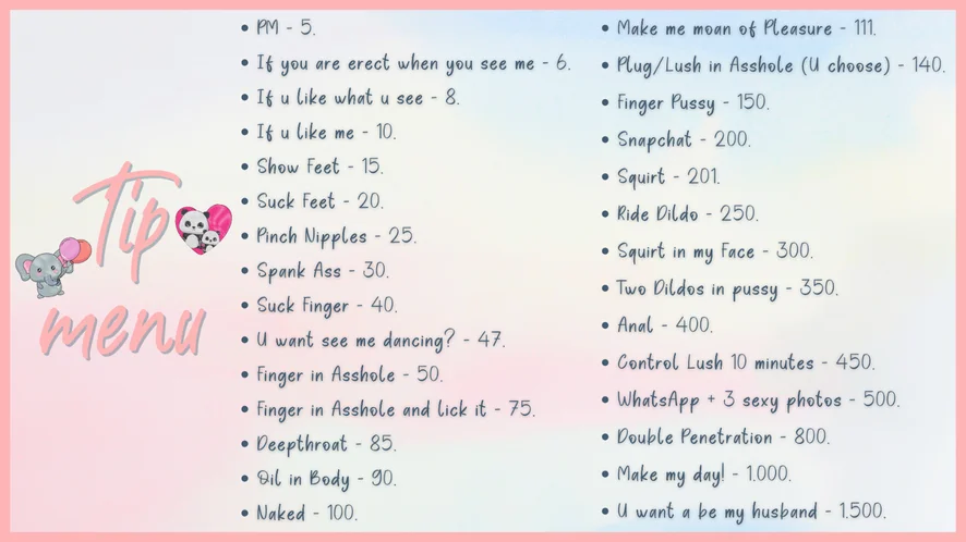 아헤가오, 스팽킹, 카멜토우, 에로틱 댄스, 음란한 대화, 풋 페티시, 딥스로트, 섹스 기구, 블로우잡, 애널, 스트립쇼, 롤플레이
