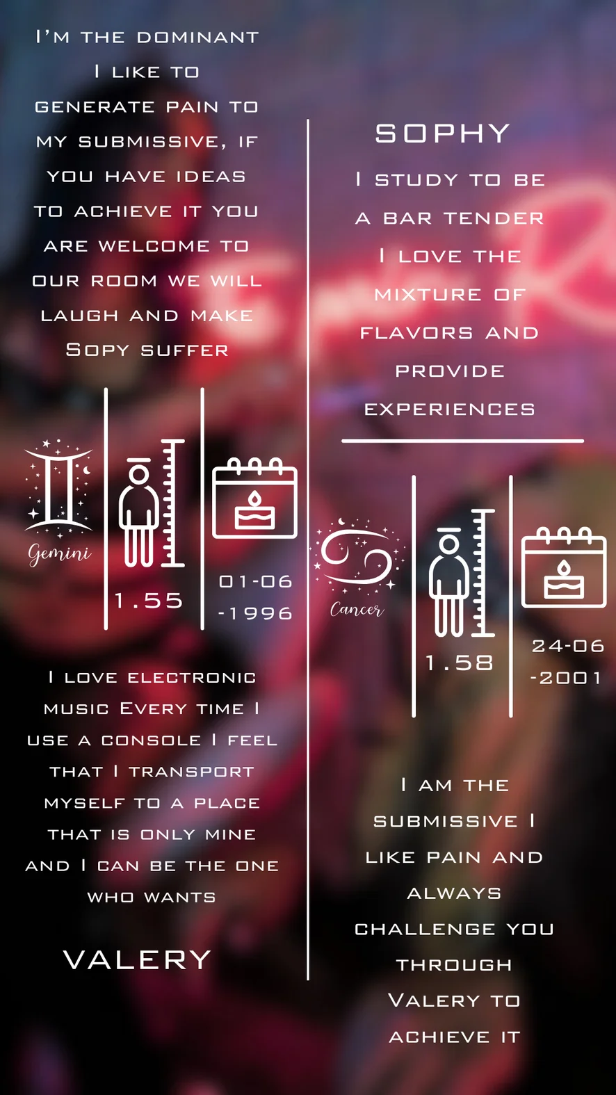 도기 스타일, 스팽킹, 리밍, 카멜토우, 스트랩온, 애널, 키스, 컴샷, 핑거링, 엉덩이에서 입까지, 딜도 또는 바이브레이터, 피스팅, 딥스로트, 애널 기구, 아헤가오, 에로틱 댄스, 스트립쇼, 섹스 기구, 니플 기구, 굴욕, 재갈, 트월킹, 삼키기, 음란한 대화