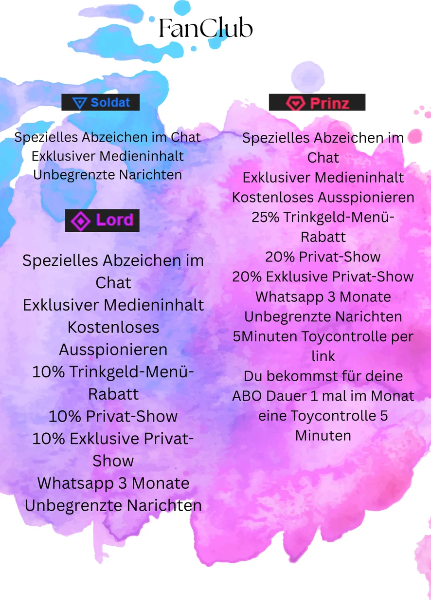 Seid nett und Respektvoll zu mir❤ und allen anderen in meinem Chatraum. Keine Befehle oder Anweisungen ohne Trinkgeld⚡. Schaut´s euch bitte mein Trinkgeldmenü an, oder mein Traumziel, auch habe ich Geile Wheel´s 💋. Keine Beleidigungen und bitte spammt nicht im Chat. Viel Spaß in meinem Stream Raum 💋🥰❤