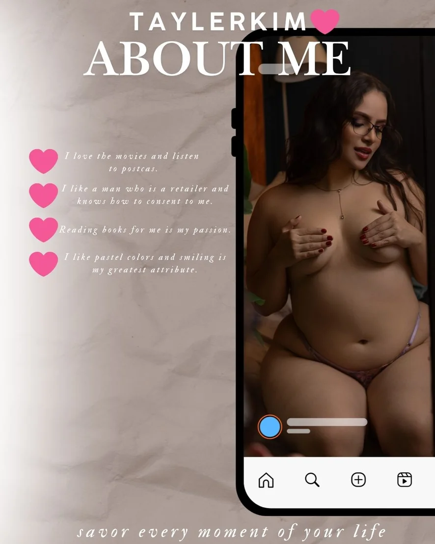 Hello, I am Tayler Kim, a Latin model with irresistible curves, naughty attitude and a lot of natural sensuality. My personality combines the tenderness of a flirtatious girl with the mischief of a woman who knows exactly how to light your most hidden fantasies.
