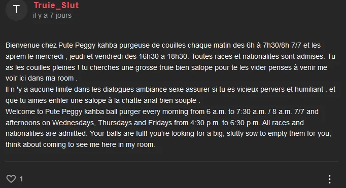 Hello my name is Peggy. Truie_Slut I am a big sissy fagott ! a magnificent Sissy for some, with a big ass, my pussy is open but deserves much better expansion level. I have been impotent for 15 years, obedient and sympathetic I no longer have any dignity of my person and I am proud of it I love to play, to be humiliated and above all to serve you as a ball vacuum, to let off steam, I can even serve as a toilet and play with you as a toilet ON PRIVATE SHOW ONLY its possible discount 50% private show . I'm looking for vicious, humiliating, playful guys, knowing or wanting to show off a big Trav lope for everyone to see! my limits here are the last letter of the alphabet. age and race unimportant, very vicious beginner appreciated. My goal is to buy myself a sex machine thanks to your tokens and thus give you control of the penetrations in my anal pussy I'm on STRIPCHAT every morning from 6AM to 8:00 PARIS HOURS see you very soon Sissy fagot Peggy the cam whore XXX