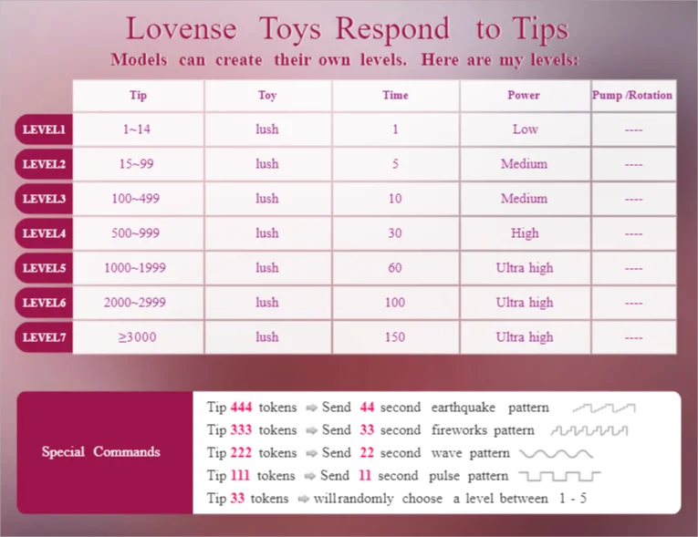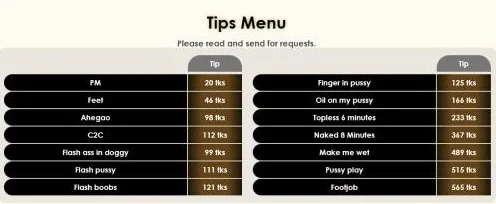 블로우잡, 도기 스타일, 음란한 대화, 스모킹, 스트립쇼, 젖치기, 상의탈의, 트월킹, 치마속, 스팽킹, 크림파이, 페이셜, 오르가즘, 셀프써킹, 오일 쇼, 아헤가오, 애널, 애널 기구, 카멜토우, 젖소, 컴샷, 딜도 또는 바이브레이터, 더블 페네트레이션, 에로틱 댄스, 페이스씨팅, 피스팅, 69자세, 스트랩온, 하드코어, 굴욕, 핑거링, 자위, 오피스, 섹스 기구, 분수, 삼키기, 게이핑, 딥스로트, 핸드잡, 니플 기구, 플래싱, 키스, 보지 핥기