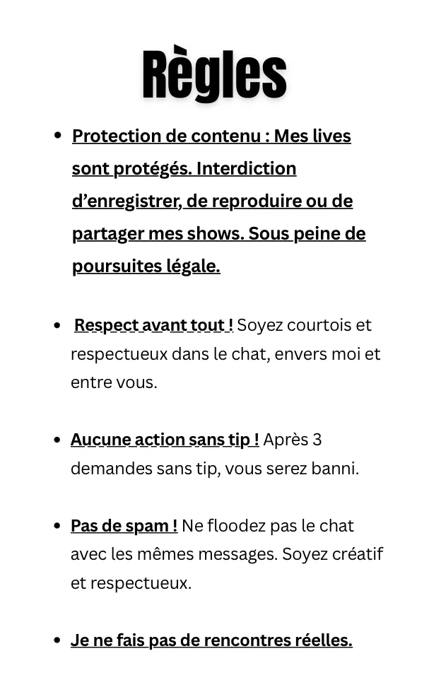 에로틱 댄스, 음란한 대화, 스팽킹, 스모킹, 핸드잡, 핑거링, 블로우잡, 딜도 또는 바이브레이터, 딥스로트, 미스트레스(여주인), 오르가즘, 상의탈의, 섹스 기구, 오일 쇼, 젖치기, 트월킹, 굴욕, 롤플레이, 자위행위 지침