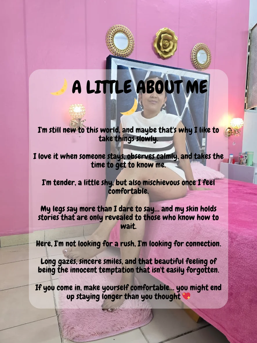 Here, I like to feel comfortable and make you feel the same. Calm conversations, glances that speak louder than words, and moments that unfold slowly. Sometimes I'm sweet and shy, other times a little mischievous… it all depends on the connection. If you approach me with respect and curiosity, there's always something special waiting for you. This space is for enjoying yourself, relaxing, and letting the chemistry do its work ✨