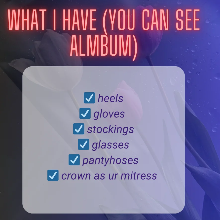 아헤가오, 하이힐, 요가, 풋 페티시, 미스트레스(여주인), 도기 스타일, 젖소, 상의탈의, 자지 평점, 자위행위 지침, 스위치, 페이셜, 자위, 치마속, 오르가즘, 페이스씨팅, 젖치기, 딜도 또는 바이브레이터, 카멜토우, 플래싱, 핑거링, 스트립쇼, 트월킹, 마사지, 굴욕, 롤플레이
