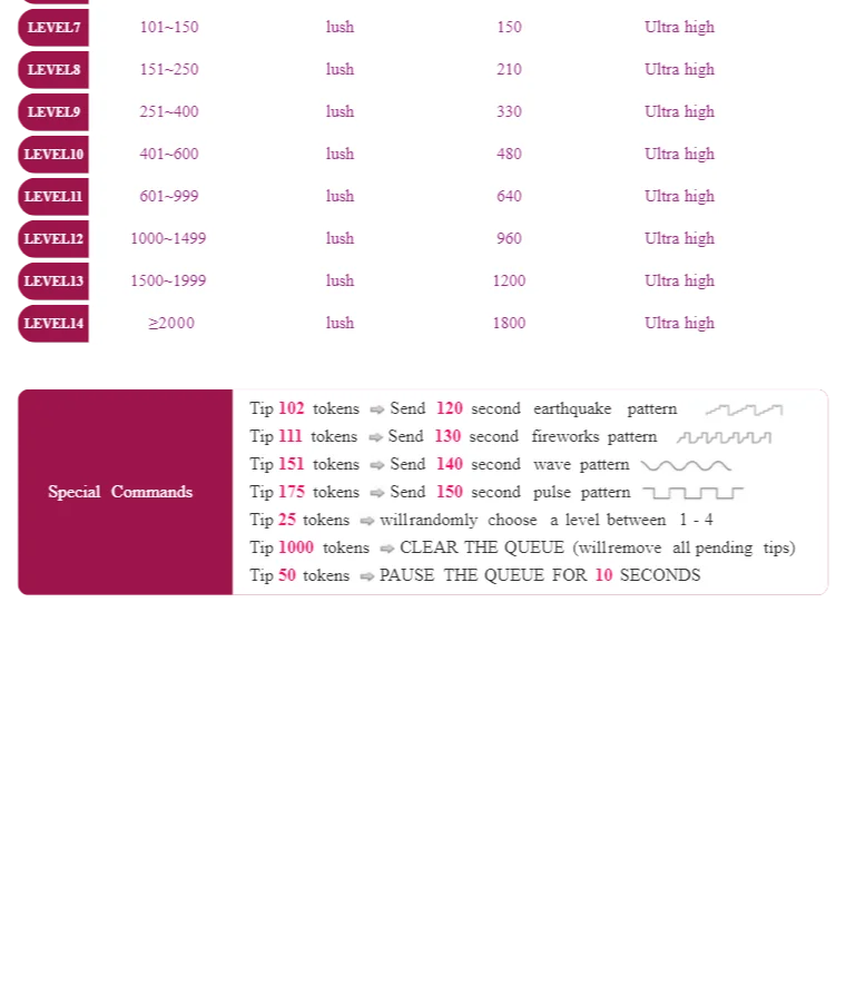 에로틱 댄스, 스트립쇼, 카멜토우, 핑거링, 니플 기구, 상의탈의, 트월킹, 치마속, 자지 평점, 요리, 스위치, 딜도 또는 바이브레 이터, 음란한 대화, 굴욕, 자위행위 지침, 오르가즘, 롤플레이, 섹스 기구