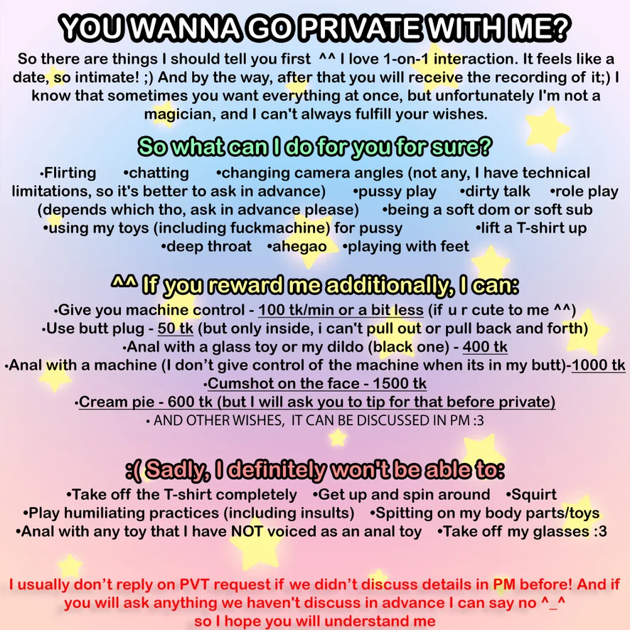 So please, if this is something i don't have in my tip menu - ask me in advance, please! Before tip or go in private (ノωヽ) I wanna you to enjoy the process as much as possible (ღ˘⌣˘ღ)