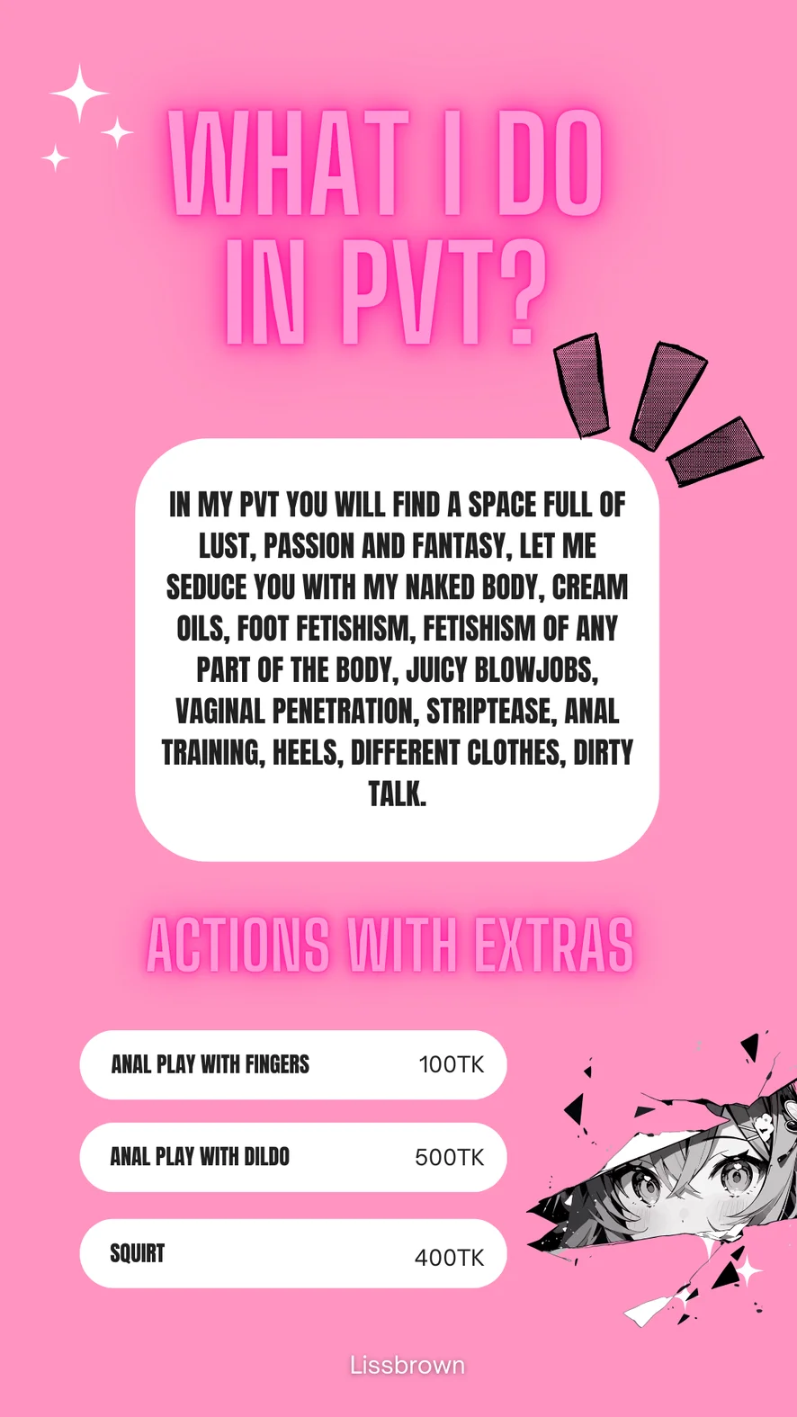 도기 스타일, 스팽킹, 에로틱 댄스, 카멜토우, 자지 평점, 음란한 대화, 트월킹, 아헤가오, 풋 페티시, 굴욕, 롤플레이, 블로우잡, 자위, 오일 쇼, 상의탈의, 치마속, 핑거링, 요가, 하이힐