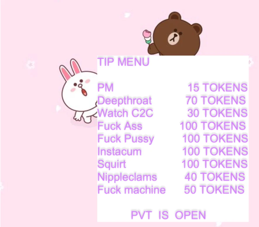 크림파이, 딜도 또는 바이브레이터, 딥스로트, 섹스 기구, 분수, 트월킹, 블로우잡, 음란한 대화, 자위, 도기 스타일, 에로틱 댄스, 스트립쇼, 재갈, 아헤가오, 젖치기, 핑거링, 오일 쇼, 애널, 젖소, 스팽킹, 더블 페네트레이션, 니플 기구, 게이핑, 애널 기구
