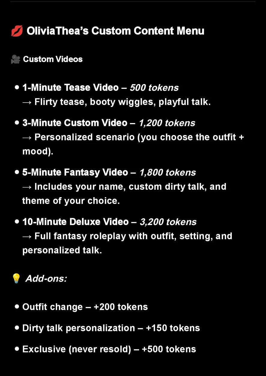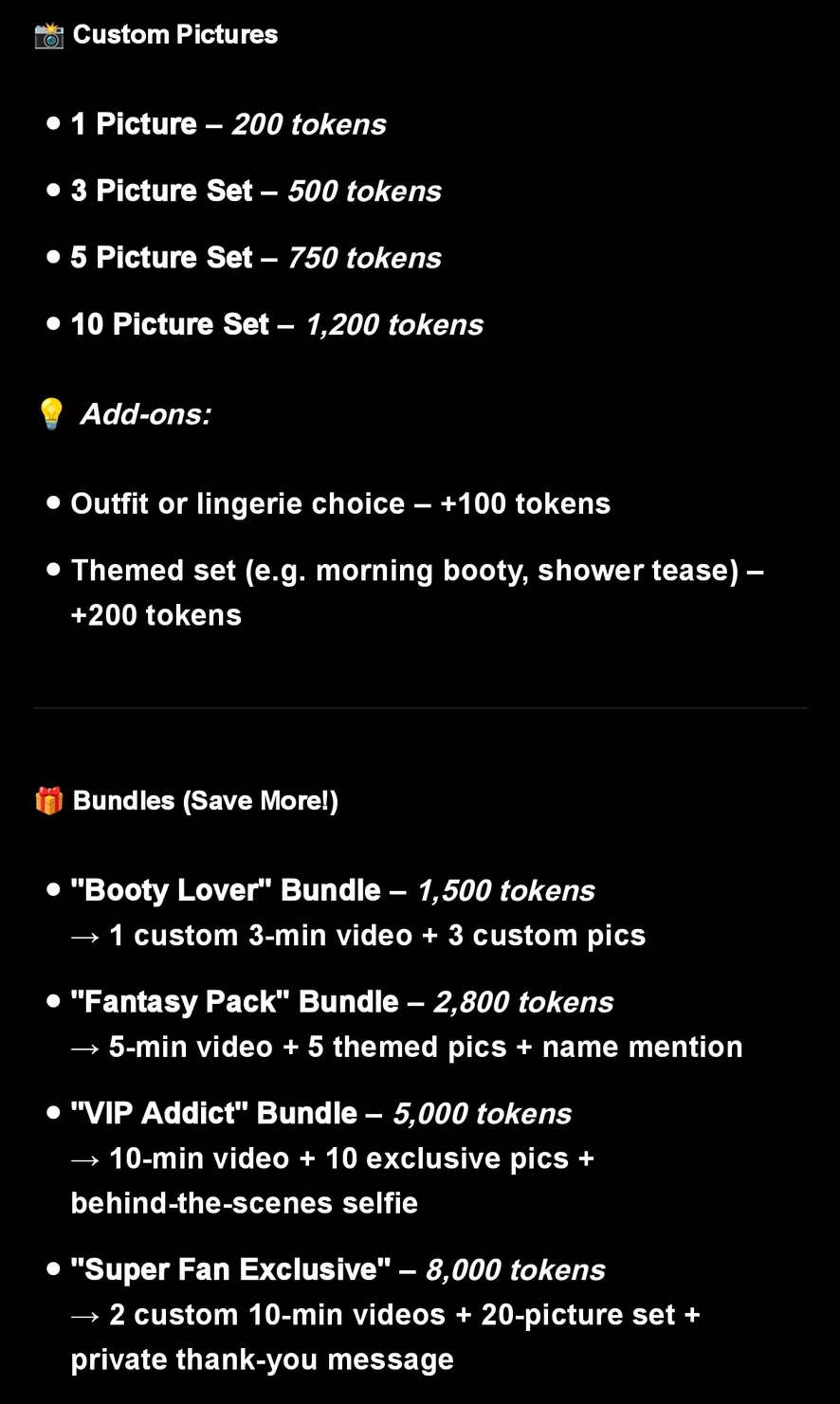 자지 평점, 자위, 스모킹, 스팽킹, 플래싱, 핑거링, 핸드잡, 하이힐, 카멜토우, 블로우잡, 라텍스, 가죽, 상의탈의, 트월킹, 스트립쇼, 나일론, 풋잡, 딜도 또는 바이브레이터, 스위치, 딥스로트, 음란한 대화, 도기 스타일, 페이스씨팅, 풋 페티시, 재갈, 자위행위 지침, 미스트레스(여주인), 니플 기구, 오일 쇼, 롤플레이, 섹스 기구, 오르가즘
