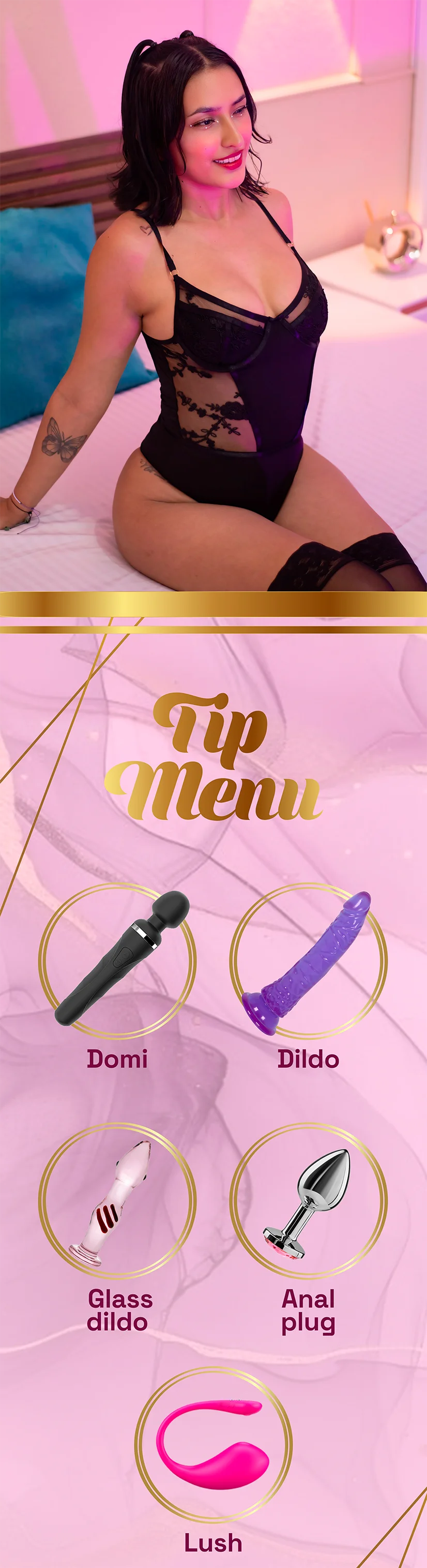 도기 스타일, 아헤가오, 스팽킹, 에로틱 댄스, 블로우잡, 오일 쇼, 스트립쇼, 풋 페티시, 트월킹, Drop of Milk, 핑거링, 섹스 기구, 자위, 자위행위 지침, 굴욕, 젖치기, 핸드잡, 상의탈의, 69자세, 나일론, 롤플레이, 페이셜, Spray Milk, 딥스로트, 하드코어, 오르가즘, 카멜토우, 음란한 대화, 자지 평점, 딜도 또는 바이브레이터, 플래싱, 하이힐, 치마속, 애널 기구, 니플 기구