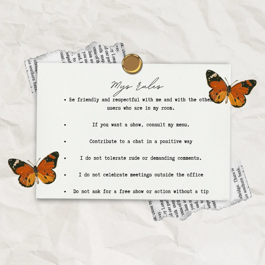 아헤가오, 도기 스타일, 스팽킹, 트월킹, 하이힐, 에로틱 댄스, 핑거링, 풋 페티시, 상의탈의, 자위, 젖치기, 섹스 기구, 카멜토우, 69자세, 요가, 딜도 또는 바이브레이터, 젖소, 오일 쇼, 하드코어, 핸드잡, 오르가즘, 블로우잡, 롤플레이, 굴욕, 스트립쇼, 분수