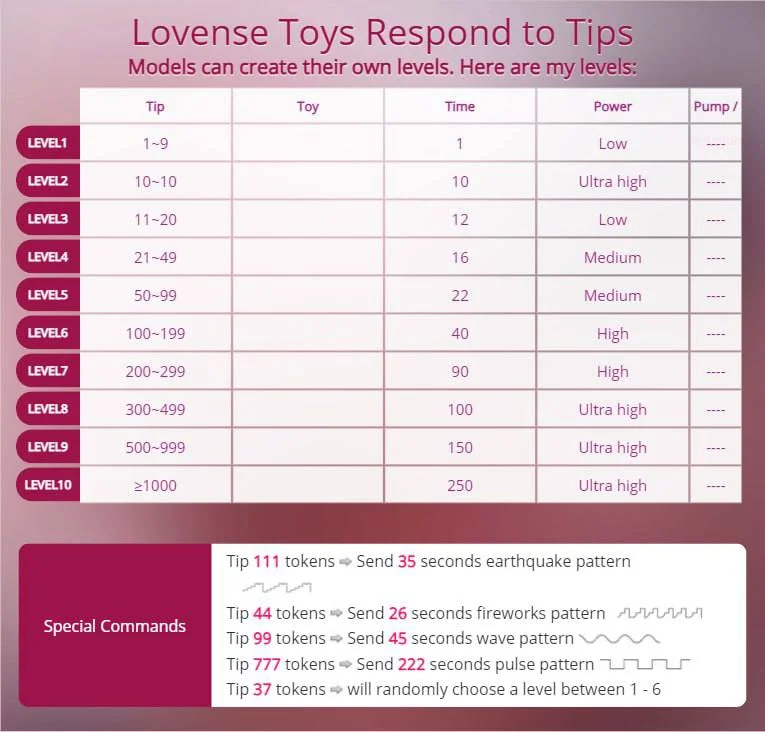 아헤가오, 블로우잡, 핑거링, 스트립쇼, 스팽킹, 음란한 대화, 자지 평점, 도기 스타일, 플래싱, 풋 페티시, 트월킹, 상의탈의, 딥스로트, 자위행위 지침, 자위, 페이스씨팅, 핸드잡, 하드코어, 하이힐, 오일 쇼, 오르가즘, 에로틱 댄스, 미스트레스(여주인), 롤플레이, 섹스 기구, 딜도 또는 바이브레이터, 재갈, 분수, 엉덩이에서 입까지